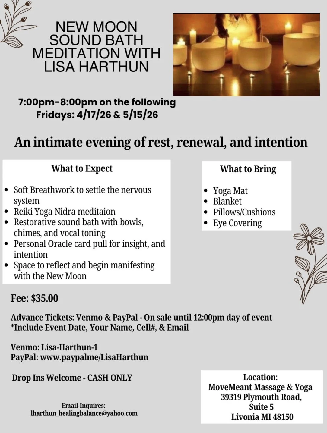 Join us for a deeply restorative New Moon gathering designed to help you slow down, reconnect, and align with the fresh lunar energy. This intimate session blends gentle movement, mindful breathwork, and a soothing reiki‑infused yoga Nidra meditation to guide you into a state of calm presence. As you settle into savasana, you’ll be immersed in the melodic frequencies of crystal singing bowls, tingsha, chimes, and soft vocal toning—each vibration supporting emotional release, energetic clearing, and the opening of space for new intentions to take root. To deepen your experience, each participant will be invited to choose an oracle card at the start of the session. Your card will serve as a personal guidepost for reflection, insight, and manifestation throughout the evening. This gathering is intentionally small to preserve a peaceful, connected atmosphere. Come as you are, and allow yourself to be held in sound, stillness, and renewal as we welcome the beginning of a new lunar cycle. All are welcome!